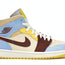 This Jordan 1 Mid SE is composed of a cream, brown, yellow, and light blue leather upper with red stitching on the heels and tongues. Maison Chateau Rouge branding on the heel tabs, sail midsoles, and yellow outsoles complete the design. These sneakers released in November of 2019.